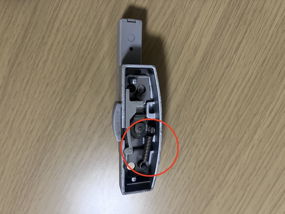 クレセント錠を窓枠から取り外し、中のバネを確認しましょう。