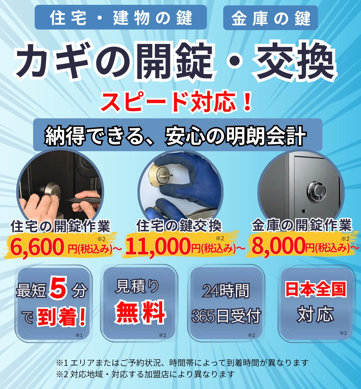 また、夜間や早朝に鍵業者へ依頼する場合は、基本料金に加えて深夜・早朝対応の追加料金がかかります。