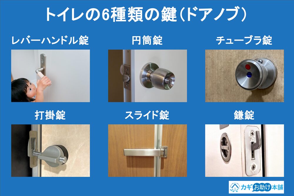 普段、何気なく使っているトイレの鍵(ドアノブ)ですが、実は大きく分けて6つの種類があります。
